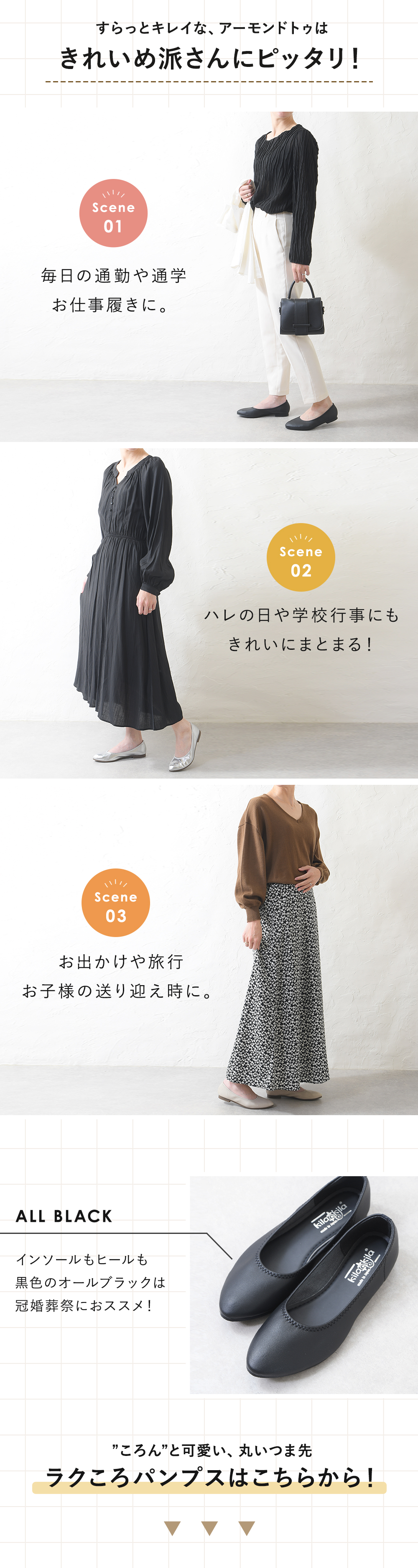 スラッときれいで、さっと快適に。 ラクすらパンプス まるすぎず、とんがりすぎない程よいアーモンドトゥだから きれいめからカジュアルまで幅広いシーンで毎日活躍してくれる。 お仕事やおでかけ、子育てまで、 あなたの毎日にしっくり馴染んでくれます。 いつでもサッと脱ぎ履きできて、 柔らかい履き心地だから一日中楽ちん。 ついつい毎日履きたくなる、そんな一足を目指しました。 ■Scene.01 毎日の通勤や通学お仕事履きに 冠婚葬祭には インソールもヒールも黒色の オールブラックがおススメ! ■Scene.02 普段のお出かけや旅行お子様の送り迎え時に 実際にご購入頂いたお客様からのお声です! 「痛くならず、疲れない」とご好評を頂いております! なんでこんなに人気なの? その秘密はこの4つ Point.01 スラッとキレイなのにゆったり快適。絶妙な"とんがり"トゥ まるすぎず、とんがりすぎない絶妙なアーモンドトゥが 足元を上品に見せながらも主張しすぎない優しい印象に。 つま先の柔らかなカーブが足指まわりに 程よいゆとりを持たせてくれるので、 窮屈さを感じにくく長時間の着用でも快適な履き心地を実現。 Point.02 履いた瞬間から足に馴染む、やわらかさ 一日中履くものだからこそ、 履き心地の良さと足への優しさにこだわりました。 柔らかく、伸縮性に優れた生地が履くたびに 足に馴染み、快適なフィット感を実現。 靴擦れや夕方の圧迫感を軽減してくれるので、 長時間履いても快適です。 Point.03 スッと履けるのに、ぴったりフィットでパカパカ知らず! こんな時ありませんか? 両手が塞がっていて 靴の脱ぎ履きが大変、、。 ママさんだとお子様を抱っこしていたりも そんなお悩みもこのパンプスが解決! ゆったりとした履き口だからスッと足入れしやすく、 かかと部分には内生地が施されていて潰れにくいので、 立ったままでも脱ぎ履きがサッと出来ます。 玄関先でついつい手に取りたくなる快適さです。 お子さんを抱っこしながらでもサッと履ける便利さも、 忙しいママさんに人気のポイントです。 さらに!パカパカ知らずで、動きやすいから毎日頼れる 履き口周りにゴム絞りが施されているので 足にぴったりフィットし、 走ってもパカパカせずに脱げにくい安心設計。 また、屈曲性に優れたkilakila独自のアウトソールで、 歩行に合わせてしなやかに曲がるので、疲れにくい。 長時間の立ち仕事やお出かけでも、しっかりサポートしてくれます。 ※本商品には滑り止め加工を施しておりますが、特殊な防滑仕様ではございません。 水や油などの液体が付着した状態でのご使用や、急な動きには十分ご注意ください。 Point.04 あなたに合う一足が見つかる!幅広いサイズ・カラー展開 なかなか自分にあったサイズが見つからない、、、。 そんな方でも大丈夫! 2S(21.5cm)〜4L(26.0cm)まで幅広いサイズ展開だから きっとあなたに合ったサイズが見つかります! \全部で17カラー!/ 色違いで揃えたくなるカラーバリエーションの豊富さ! シーンや季節ごとに揃えるリピーターさんも多数! 他にも!人気の秘密はこれだけじゃない! ■高反発インソール/抗菌・防臭! インソールには肉厚の高反発クッションを採用! 歩行時の衝撃を反発し長時間履いても疲れにくい足に。 嬉しい「抗菌防臭加工」も施されています。 ■軽量設計! 片足たったの136g!靴の重さからくる疲れを軽減し、 1日中履けるほど快適な軽さに! \シリーズ累計30万足突破/ たくさんのご注文ありがとうございます! 【DETAIL】 シボ感のある生地と さり気ないステッチが可愛い サラッとしたキャンパス生地の内生地で 素足で履いても心地良い。 1.5cmのローヒールで歩きやすさ抜群! -ご購入前のご注意- アイボリーはホワイトのような真っ白ではなく、 ライトグレーのような深みと風合いのある色合いです。 繊細な生地の色味の為、光の明るさや種類によっても ライトオークや他の色に見えることがございます。 上記理由での返品・交換等は承ることが出来ませんので ご了承くださいませ。 とんがりつま先のアーモンドトゥパンプス商品番号 k58-398511 価格3,190円(税込) 【次回使える145円引きポイント獲得】 おうちで試し履き!往復送料無料